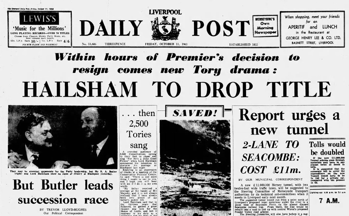 The Liverpool Daily Post reports on Hailsham’s speech but warns his supporters, ‘Butler leads succession race.’ 11th October 1963.